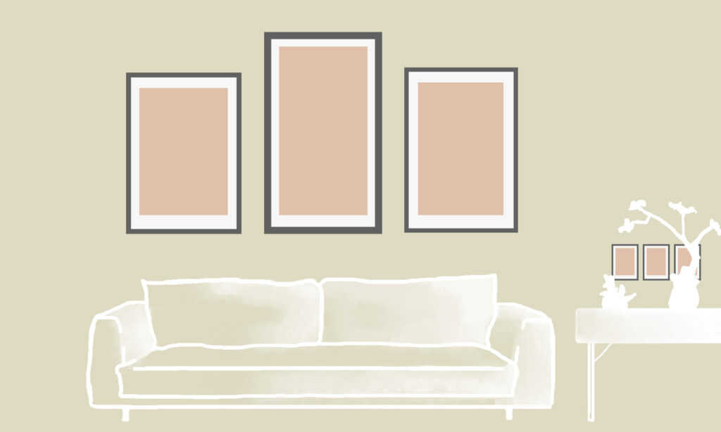 En måte å holde en bildegruppe symmetrisk og ryddig på, er å sette sammen en gruppe på tre, der det midterste bildet er hovedfokus. Dette skaper et litt mer avslappet uttrykk, samtidig som det er organisert.