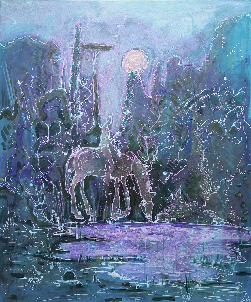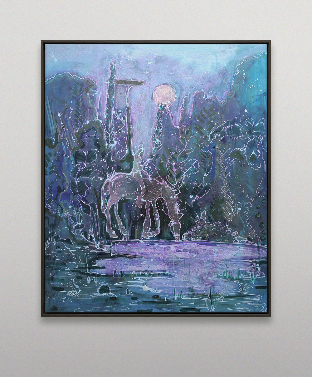 • "Historie" er et originalt maleri på lerret av kunstner Lea Alstad. Motivet viser et abstrakt og surrealistisk landskap i blåtoner med to personer.
