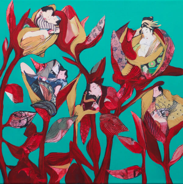 • "Herbarium #5 After Sunga" er et lite originalt kunstverk på lerret av kunstner Luis Bivar i grønn og rødfarger. Motivet er surrealistisk hvor man finner mennesker inne i blomstene.