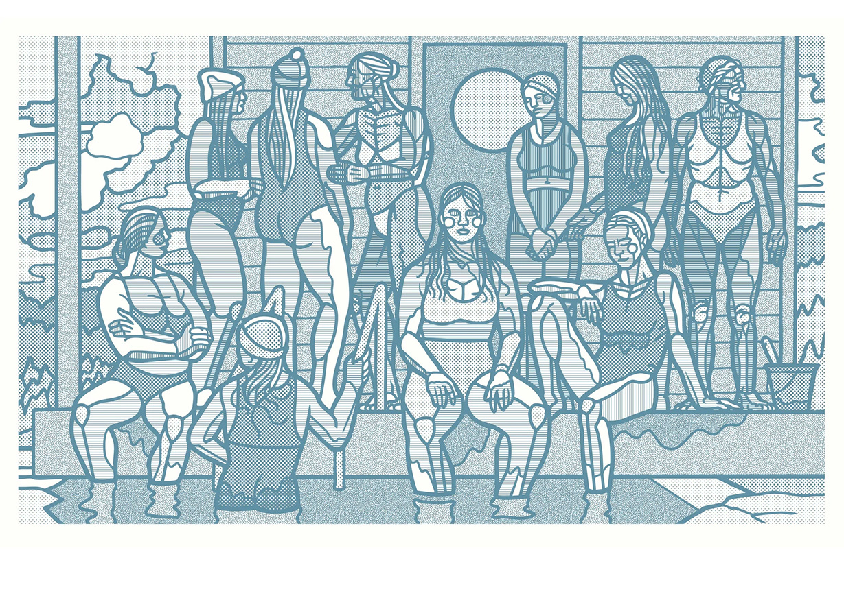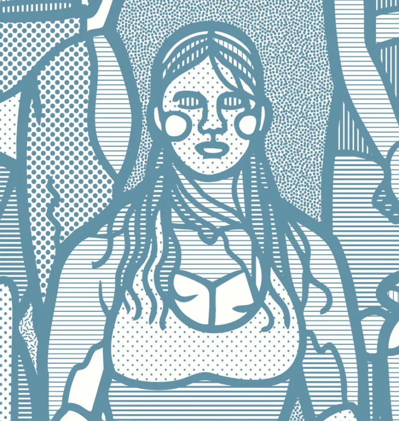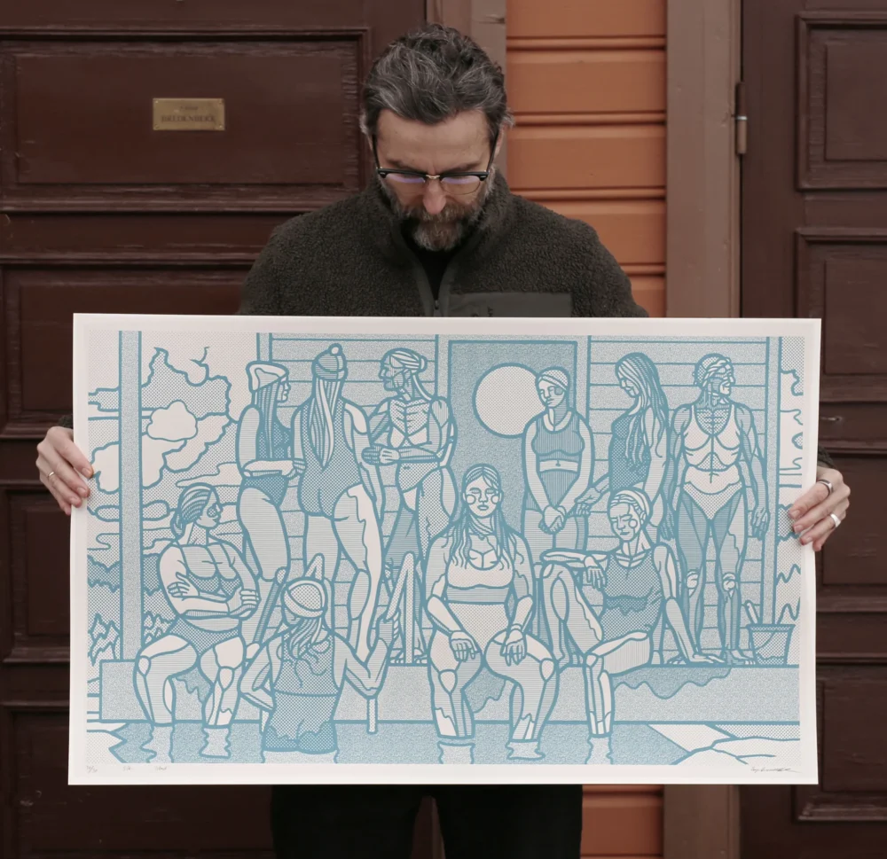 • Kunsttrykk av kunstner Børge Bredenbekk med tittelen "Strandscene". Kunstverket er turkis og viser mange personer på en strand i ulike situasjoner.