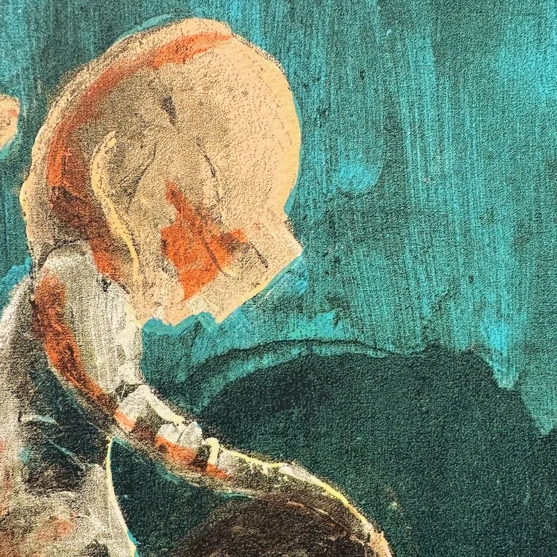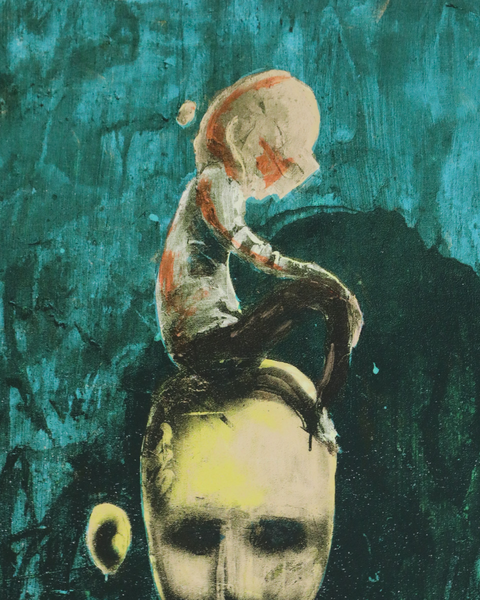 • Det originale maleriet "De Som Kommer Etter" av Ståle Gerhardsen viser en person med tre barn i grønne toner.