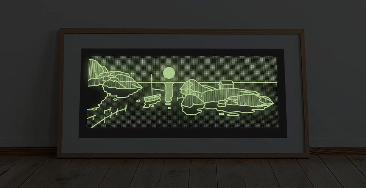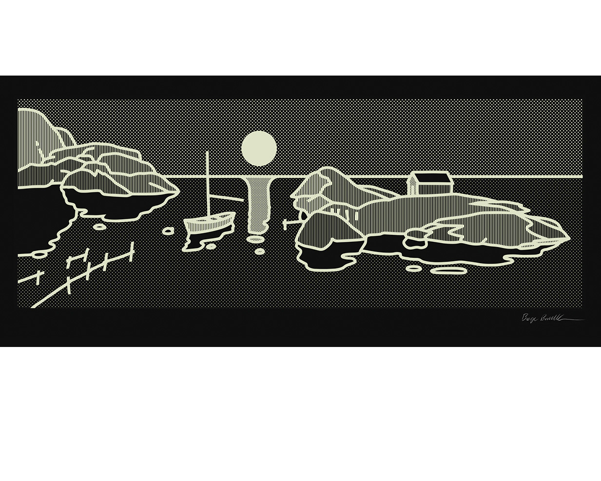 Selvlysende trykk. Trykket er grågrønnhvit på svart papir men lyser grønt i mørket pga ekstra lag fosfor (samme virkestoff som refleks). Håndtrykket silketrykk i begrenset opplag.
