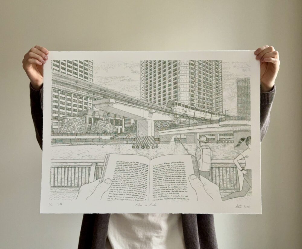 • Silketrykket "Vidde" av Anders Wunderle Solhøy viser et norsk fjellandskap og en hånd som holder et kompass