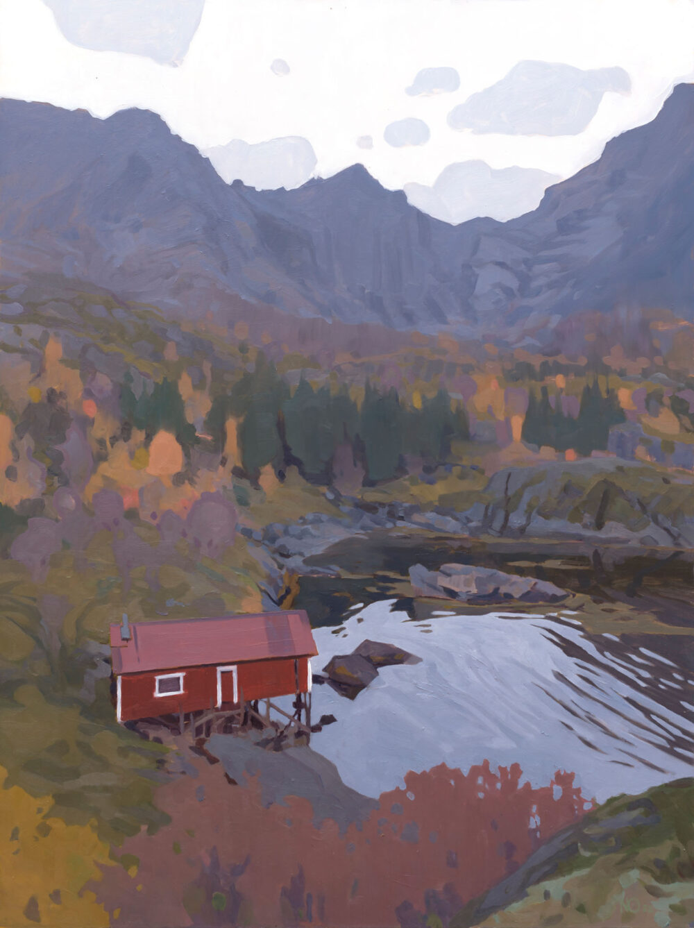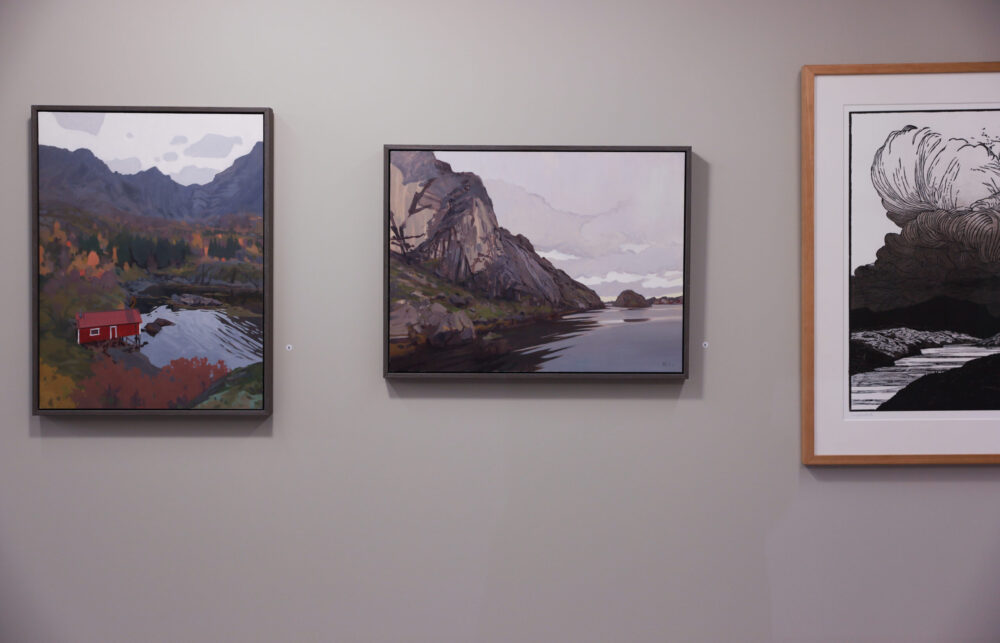• "Langalivatnet" er et tresnitt av kunstner Nicholas O'Leary som viser et landskap med kraftige skyer i sort hvitt.