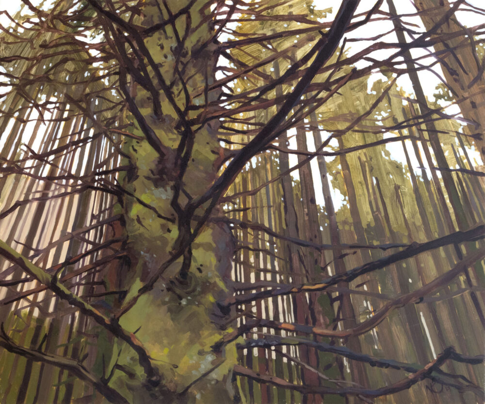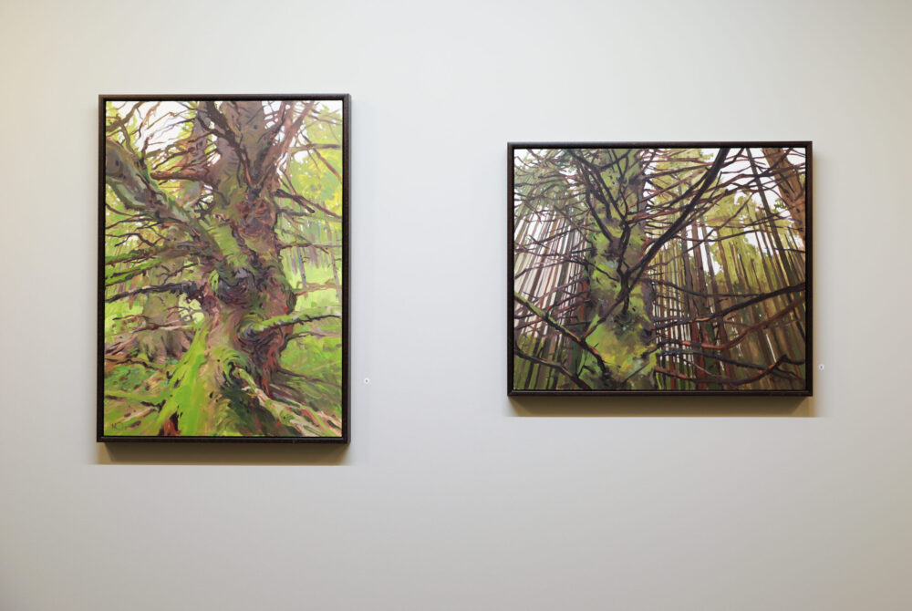 • "Langalivatnet" er et tresnitt av kunstner Nicholas O'Leary som viser et landskap med kraftige skyer i sort hvitt.