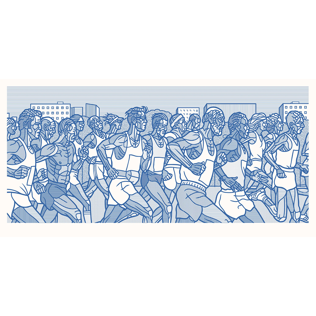 • Kunsttrykk av kunstner Børge Bredenbekk med tittelen "Strandscene". Kunstverket er turkis og viser mange personer på en strand i ulike situasjoner.