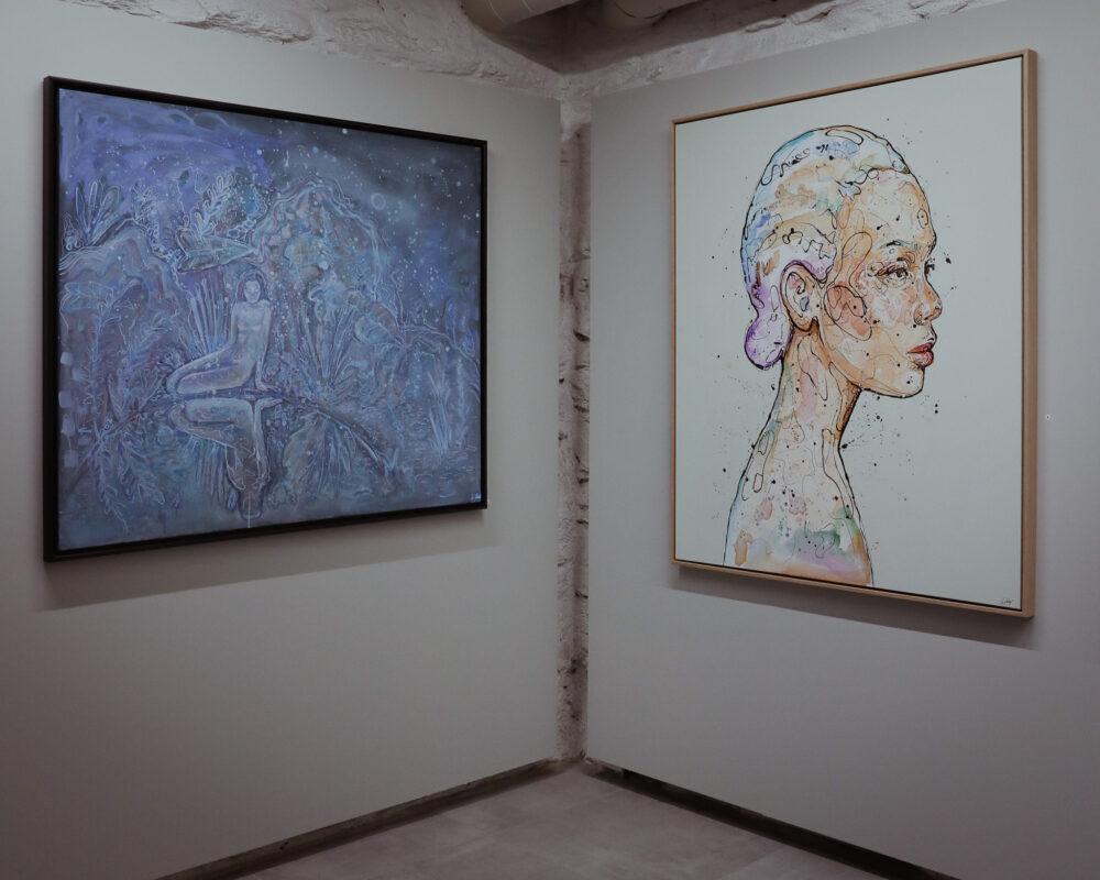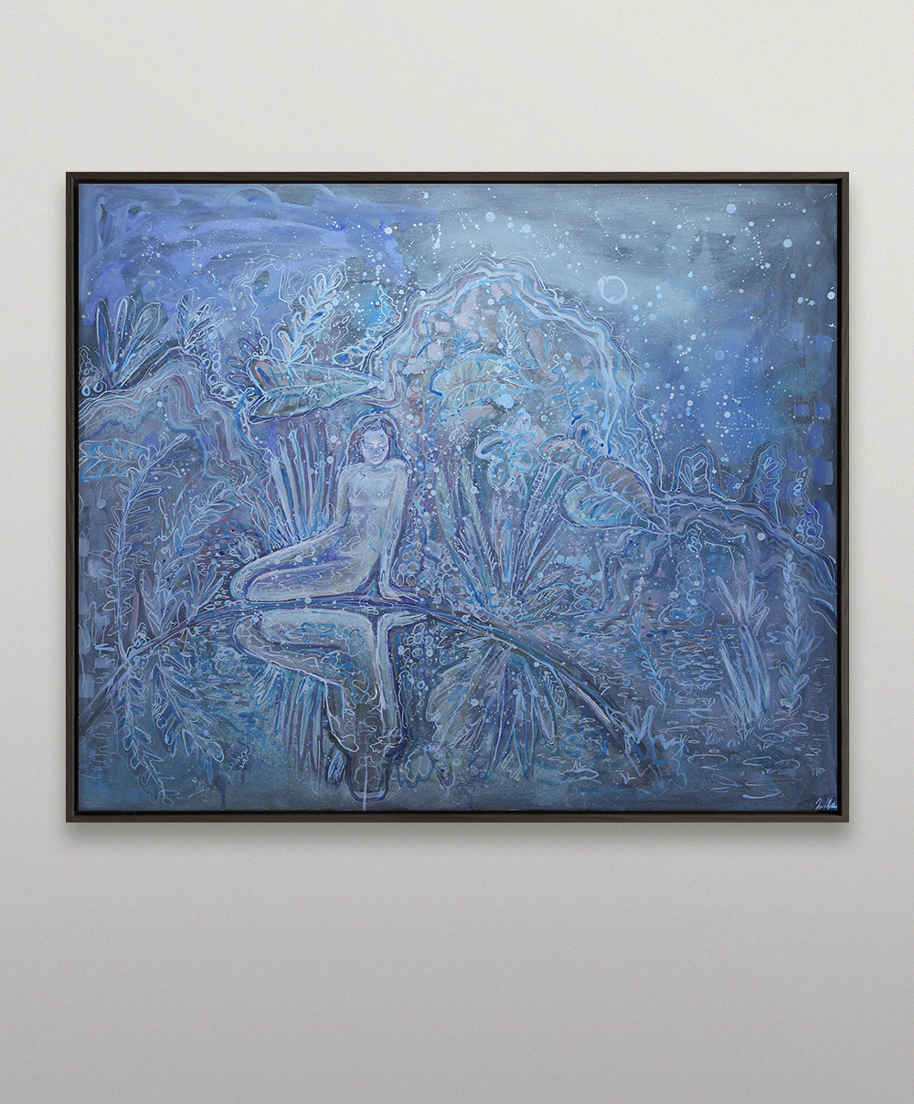 • "Historie" er et originalt maleri på lerret av kunstner Lea Alstad. Motivet viser et abstrakt og surrealistisk landskap i blåtoner med to personer.