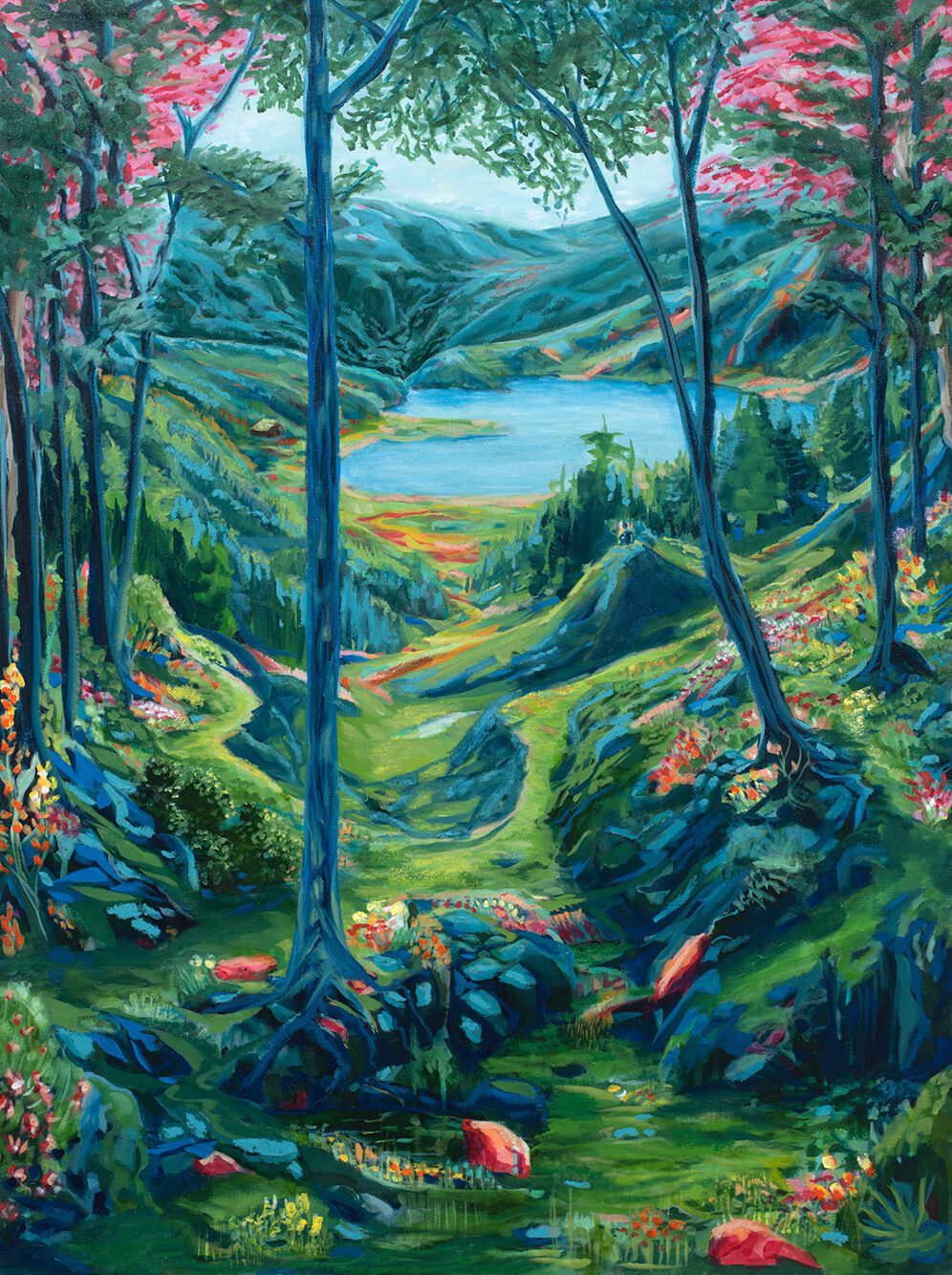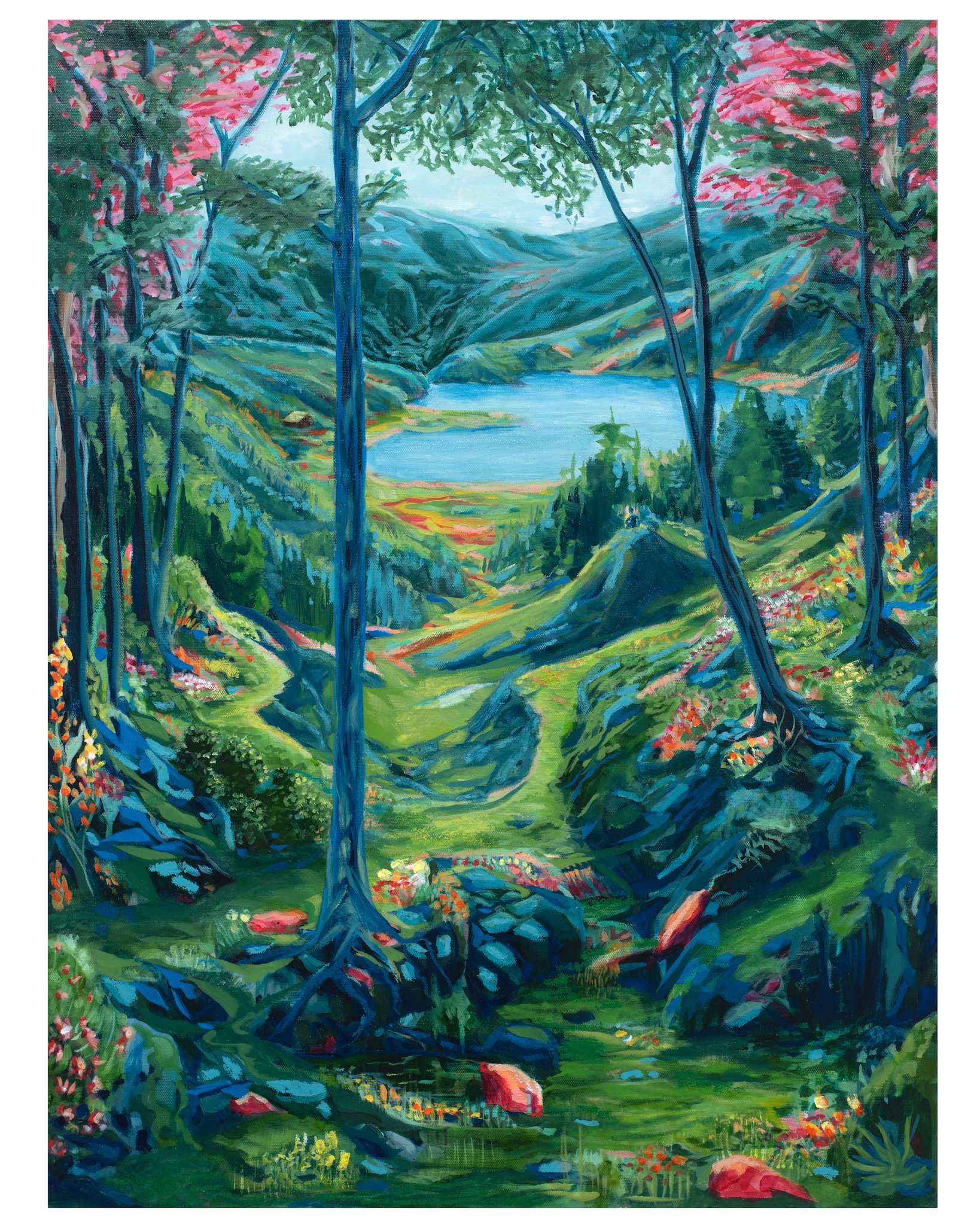 • "Røtter i Fjell og Fjord" er et trykk i begrenset opplag av kunstner Sebastian Slotte. Verket viser et lanskap i abstrakt og fargerik stil.