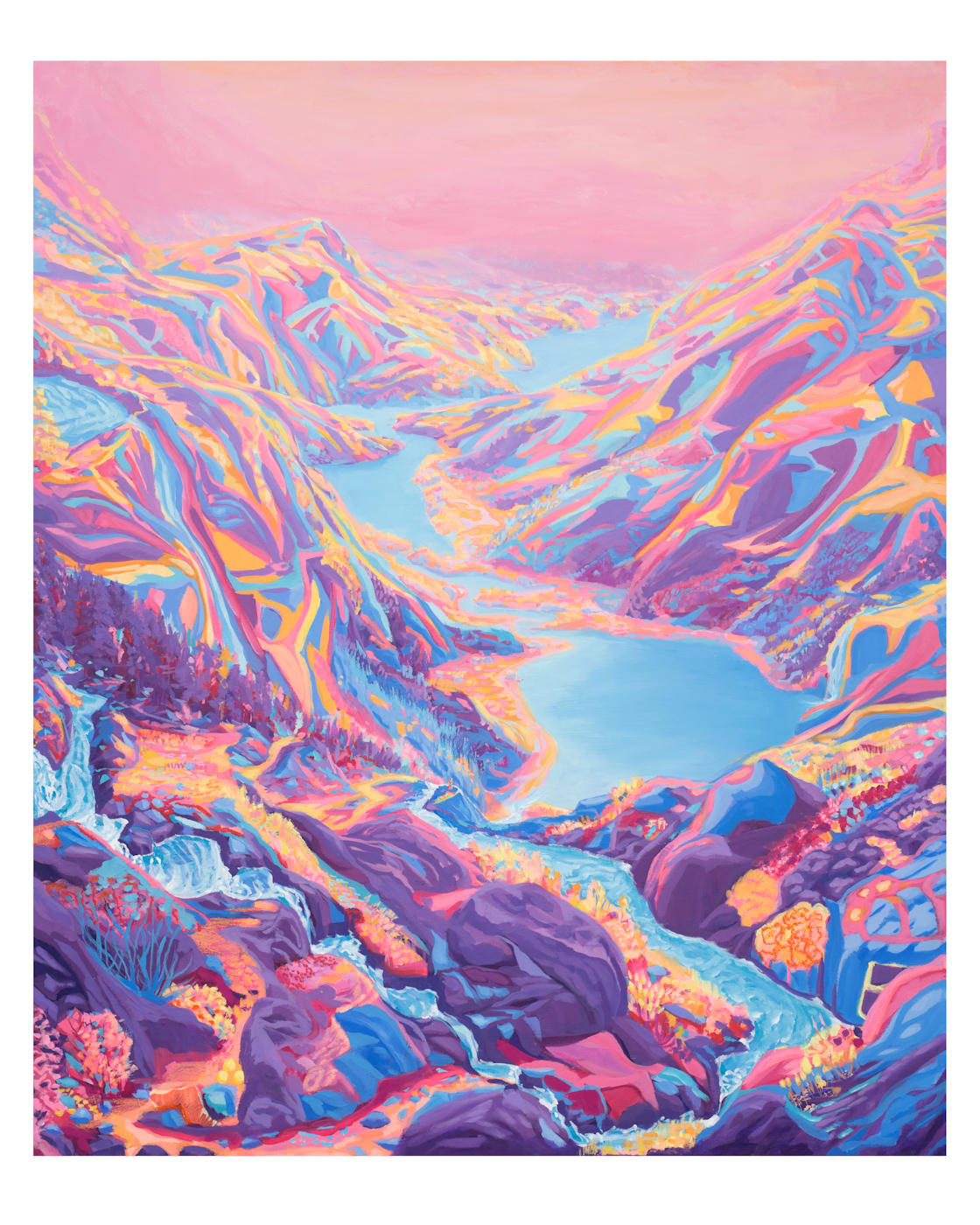 • Kunsttrykket "Rotløs" av kunstner Sebastian Slotte viser et nordsik landskap i sterke blå og rosafarger
